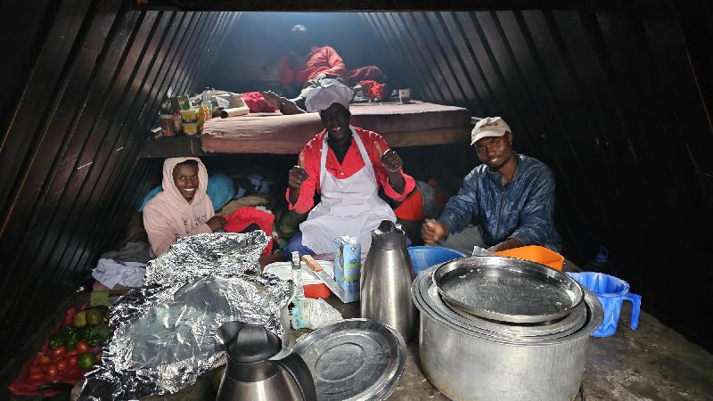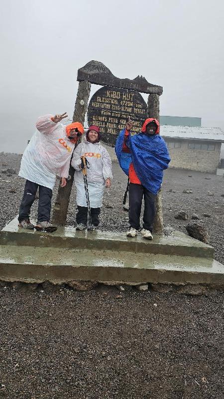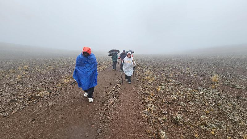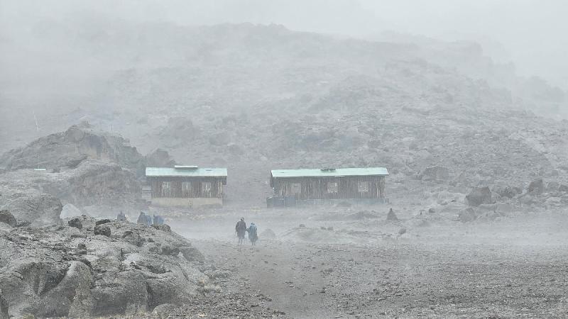 Kurz nach 7 Uhr waren wir wieder in der Kibohütte angekommen. Mein Schwindel liess mit jedem Schritt nach, zum Glück ! In der Kibohütte gratulierten mir alle Porter = Träger zu meinem Gipfelsieg und Dewis schenkte mir heissen Tee ein , nahm mir meinen Rucksack ab und die nassen Kleider, er ist wirklich der gute Geist in unserem Team . Wir sind alle zu einer grossen Familie geworden. Nach einer kurzen Pause , musste ich meine und Roy's Sachen packen und weiter gings Richtung Horombohütte . Ich hatte gehofft, dass sich das Wetter etwas bessert und wir dir 3 stündige Wanderung genissen können, aber im Gegenteil, der Wind peitsche uns den Regen ins Gesicht. So