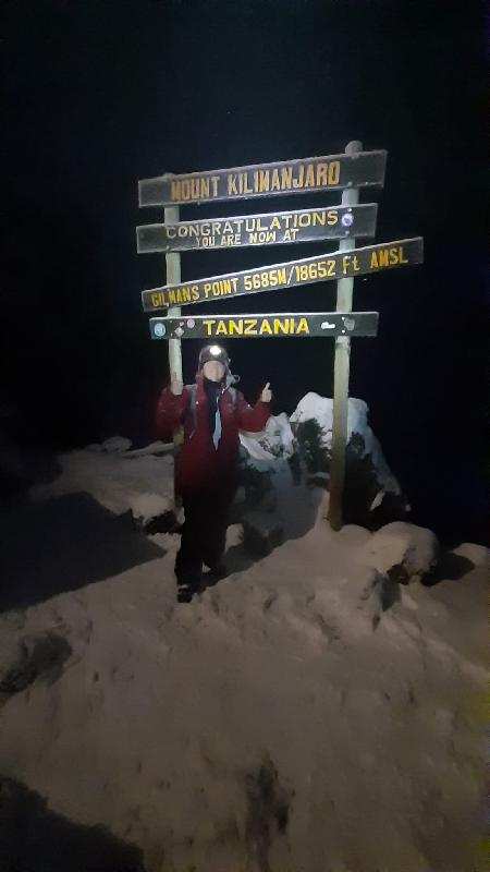 So stapfen wir endlich um Mitternacht mit Stirnlampe bewaffnet , eingepackt in etliche Lagen Kleider den Berg hinauf. Zuerst bei Regen und eine halbe Stunde später bei Schneefall. Ich hatte es mir anders vorgestellt, mit Roy an meiner Seite, unter dem Sternenhimmel dem Gipfel entgegen. So musste ich mir all meinen Mut und meine Motivation zusammen klauben. Step by Step , nicht zu viel denken , fast in Trance , schleppten wir uns den Berg hinauf , pole pole wie die Einheimischen sagen, langsam langsam, hinter mir all die Stinlampen , die das gleiche Ziel haben wie ich , den Uhuru Peak, bei Sonnenaufgang zu erreichen. Wie Alfred den Weg fand , ist mir ein Rätsel, im Zick, Zack gings hoch , alle Stunde gabs 5 Min. Trinkpause und einen Farmer Stengel, oder Traubenzucker, falls man die Kraft hatte seinen Rucksack zu öffnen. Bryson , mein Bergführer, gab mir meine Trinklasche , half mir mit den Hanschuhen anziehen und ermunterte mich , mit seinem Lächeln. Ich kam zuletzt dank ihm auf dem Kraterrand an. Nach gut 4 Stunden , änderte sich der Weg, er wurde steinig und felsig , zum Teil musste man sich mit den Händen hochziehen , manchmal kroch ich auf allen Vieren weiter, da die Kraft langsam nachliess. Mittlerweile stapften wir durch tiefen Schnee, die Jacke und Mütze war steiff gefrohren. Mir war schwindlig und ich wankte wie eine Betrunkene , konnte mich kaum noch auf den Beinen halten, alle paar Schritte musste ich eine Pause einlegen Von weit her hörte ich die Bergführer singen, um uns alle zu motivieren , es war unglaublich. Irgendwann , erklärte ich Alfred und Bryson , dass ich keine Kraft mehr habe und umkehren will, aber sie meinten , es ging nur noch ein kurzes Stück bis zum Kraterrand, ich müsse durchhalten und tatsächlich nach ca. 5 Min. stand ich oben am Gilmons Point, kurz vor halb 6.